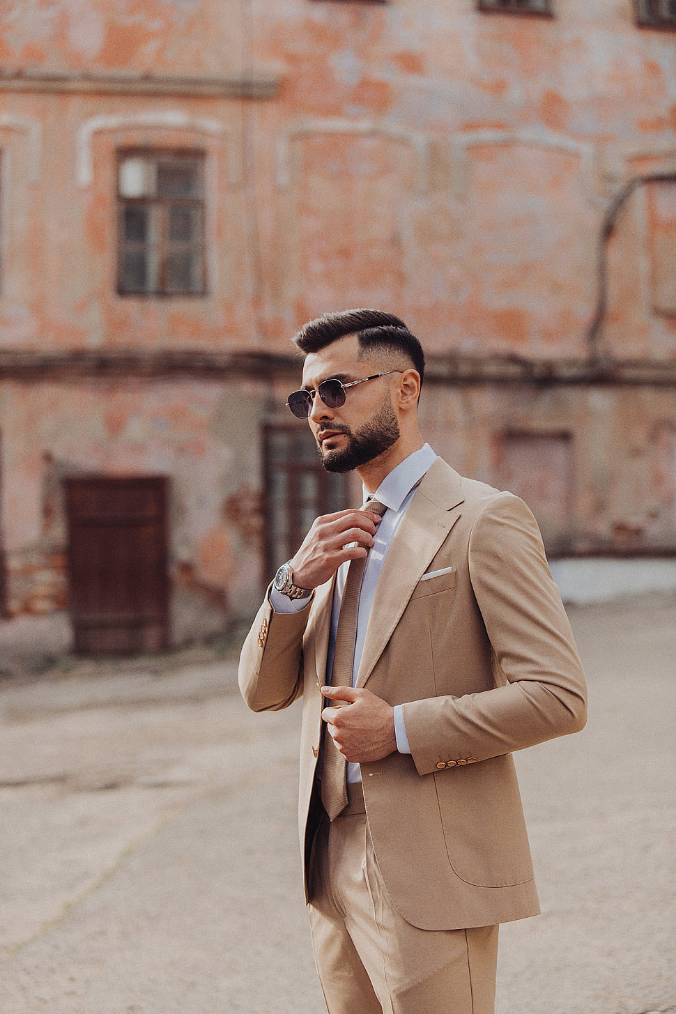 Альбомы: Мужской костюм двойка бежевого цвета с накладными карманами